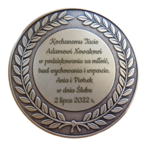 Personalizowany medal stanowi oryginalny upominek i pamiątkę dla gości weselnych. Medal jest wybijany z matrycy. Napisy są wyraźne i czytelne dzięki efektowi kontrastu pomiędzy wypukłymi napisami i wklęsłym, patynowanym tłem. Klasyczne piękno zamknięte w małym krążku.